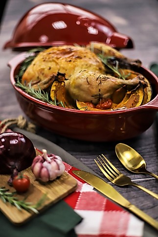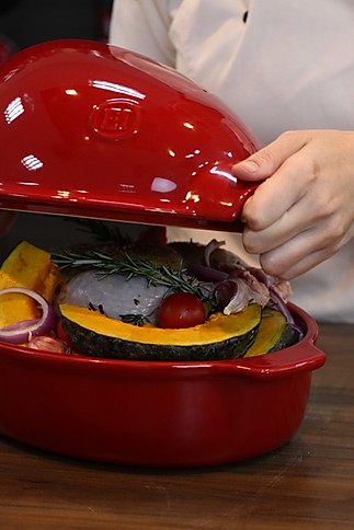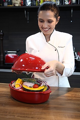 O roaster inteiramente feito de cerâmica garantirá o cozimento perfeito e uniforme do frango e dos vegetais e ainda poderá retirar o prato do forno e levá-lo direto à mesa, já que sua vibrante cor vermelha fará com que sua mesa de Natal fique elegante e completa.