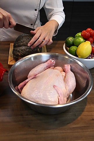 Disponha o frango no roaster e em seguida, adicione os demais ingredientes como abóbora, tomate, cebola, alecrim e alho até preencher todo o refratário.