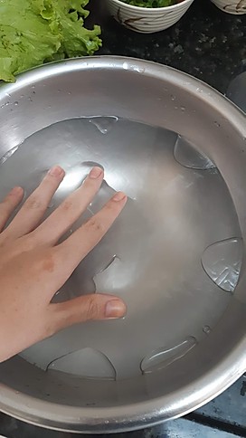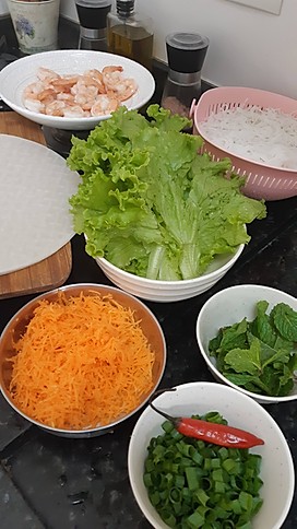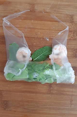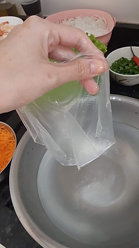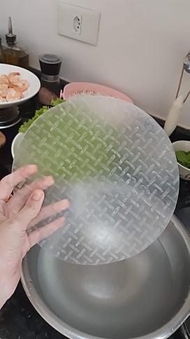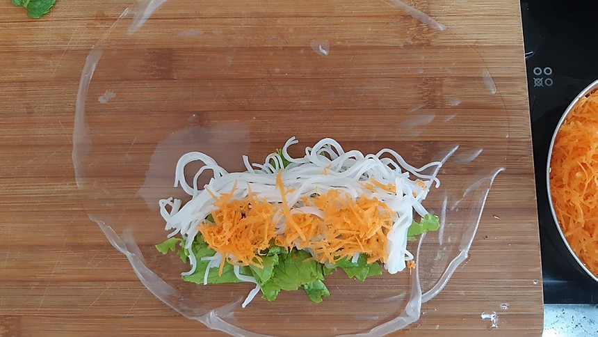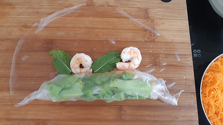 Coloque água em temperatura ambiente em uma tigela grande e coloque uma folha de arroz para hidratar. Quando perceber que a folha já está maleável, retire da água – isso leva aproximadamente 1 minuto. Coloque a folha de arroz hidratada em uma tábua e em uma das pontas coloque o alface, a cenoura ralada e o macarrão de arroz. Dobre a ponta até cobrir esse recheio. Em seguida coloque os camarões e as folhas de hortelã. Dobre as laterais e agora termine de enrolar o rolinho.