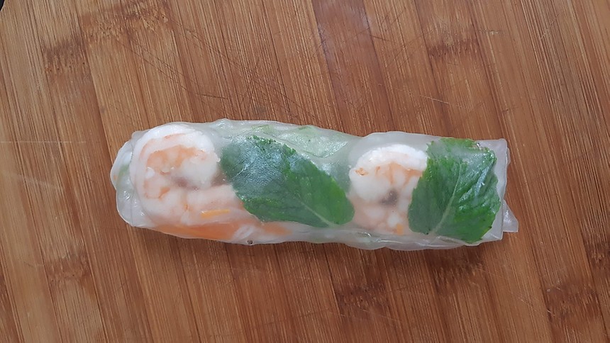 O rolinho é recheado tradicionalmente com macarrão de arroz, alface, cenoura, hortelã e camarão. Tudo isso envolto em uma “banh trang” que é uma folha feita de, adivinhe só, arroz!