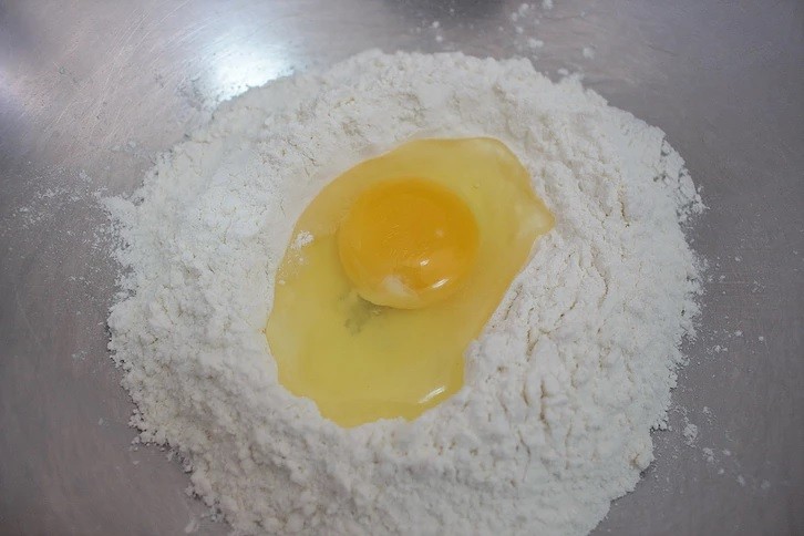 Despeje a farinha de trigo na bancada e faça um buraco no meio. Coloque os ovos inteiros e comece a mexer devagar e com cuidado. Vá misturando os ovos com a farinha de trigo lentamente até que tudo tenha sido incorporado. Sove até que a massa fique homogênea e elástica.