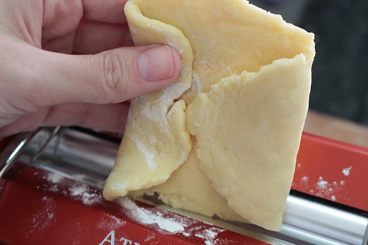 Divida a massa em 4 partes iguais para facilitar na hora de passar no cilindro. Coloque a Atlas 150 Marcato na posição 0 e comece a passar a massa pelos rolos lisos. Repita a passagem várias vezes, dobrando a folha de massa na metade. Polvilhe levemente a folha a cada passada. Quando perceber que a massa já está lisa e correta, rode para a posição 1 e passe uma vez. Mude para a posição 2 e passe uma vez, e assim por diante, até atingir a espessura desejada. Costumo passar até a posição 6. Feito isso, você terá uma folha para produzir de massa. Posicione a folha de massa no utensílio e corte seu macarrão.